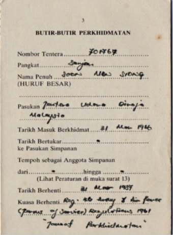 Sgt Soon Men Siong RMAF was born on 11th December 1946; he is the younger brother to Capt Soon Tet Loy RMN and the 3rd son of Boon Leong. He had joined the Royal Malaysian Air Force (RMAF) on 31st March 1966 and received his basic training at the Taiping base. He qualified (through his training in the Royal Air Force Base Seletar, Singapore) and served throughout as an RMAF Aero Fireman.