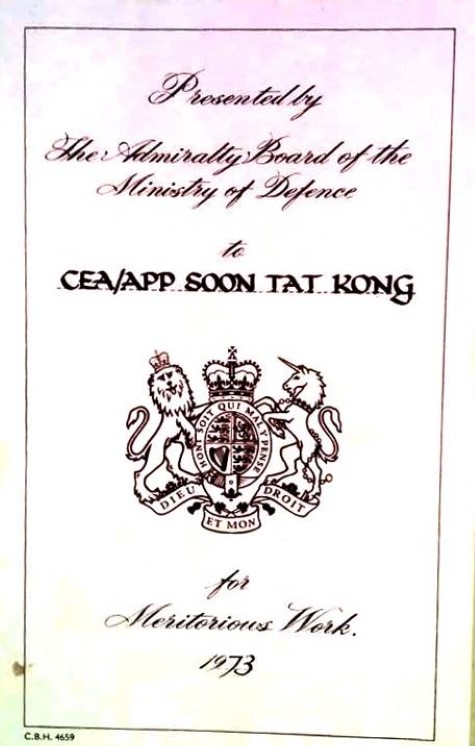 Tat Kong graduated as a Controls Electrical Artificer (CEA) in 1974, at the Naval Electrical School in HMS Collingwood, Portsmouth United Kingdom. He spent the initial year at HMS Fisgard in Plymouth in 1969 where he graduated by capturing The Most Prestigious “Captain’s Prize”.