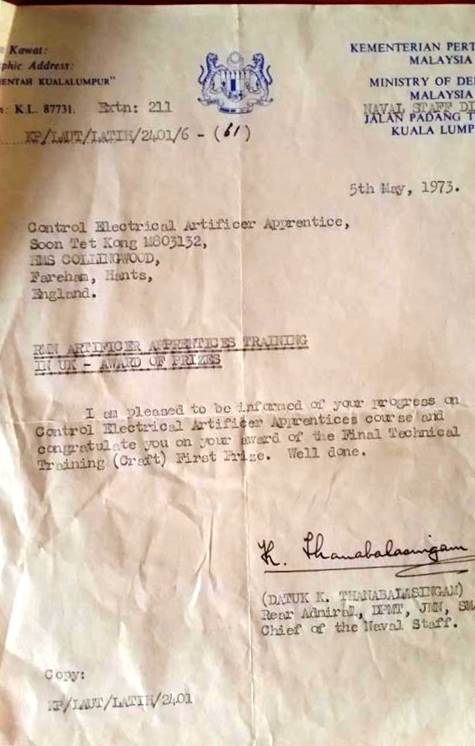 He had joined the Royal Malaysian Navy (RMN) on 8th May 1970 and was selected to be trained in a three and a half year Naval Artificer Apprenticeship Course at the Royal Australian Navy Apprentice Training Establishment (RANATE), HMAS NIRIMBA, New South Wales Australia.