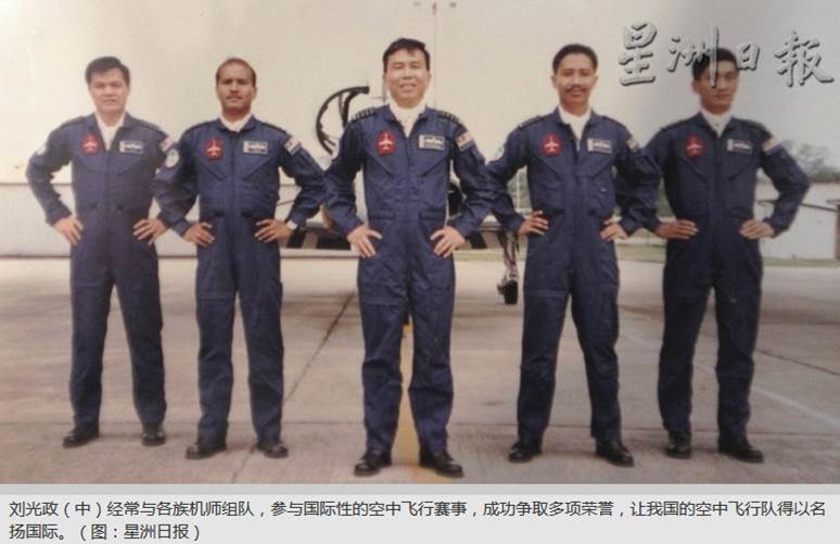 刘光政也曾和同僚在五国联防演习时,在模拟中骑乘CA27战机击败了幻象3战机;他说,这说明我们的战斗机机师是有竞争力的,甚刘光政(中)经常与各族机师组队,参与国际性的空中飞行赛事,成功争取多项荣誉,让我国的空中飞行队得以名扬国际。